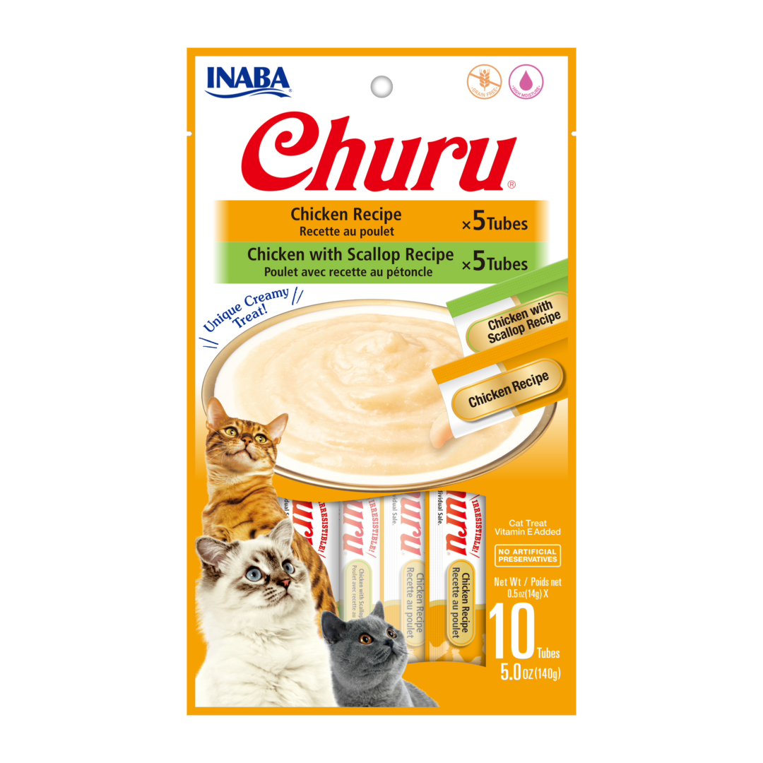 Mima a tu gato con este delicioso paquete mixto de 10 tubos Churu, que combina lo mejor del pollo natural con el toque gourmet de las vieiras. Perfecto para premiar, hidratar y compartir momentos especiales con tu felino.
