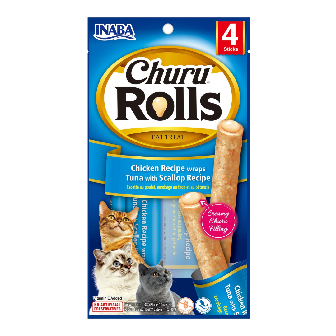 Haz que cada premio sea una experiencia inolvidable para tu gato con los Churu Rolls Chicken Wraps Tuna with Scallop Recipe de Inaba. Estos snacks están elaborados con pollo real, atún y vieiras (scallop), ingredientes de calidad premium que aportan sabor irresistible y proteínas esenciales.