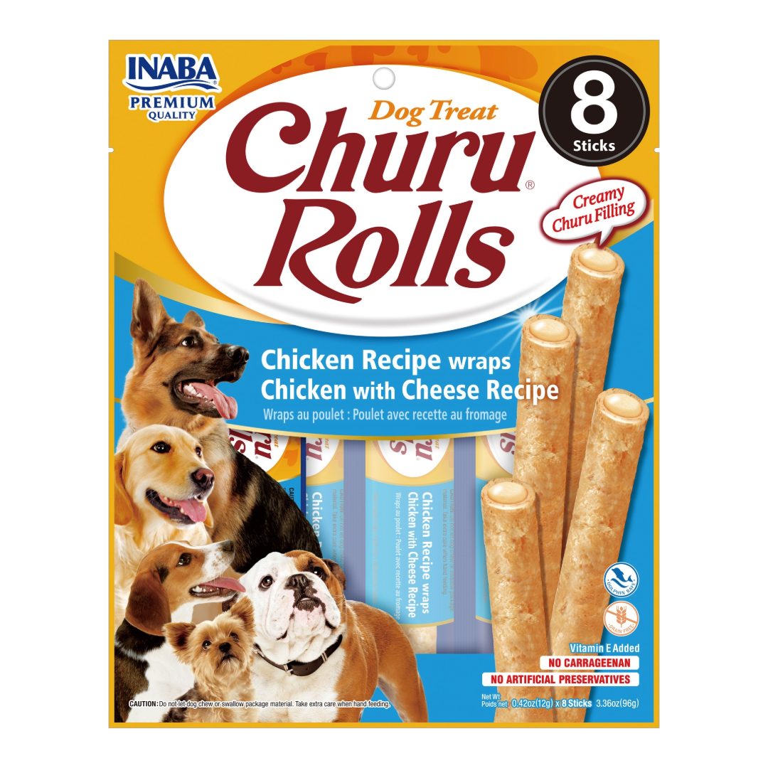 Churu Rolls de Inaba combina lo mejor del pollo de granja con un toque cremoso de queso, envueltos en una suave barrita horneada que hará que tu perro se vuelva loco de felicidad.